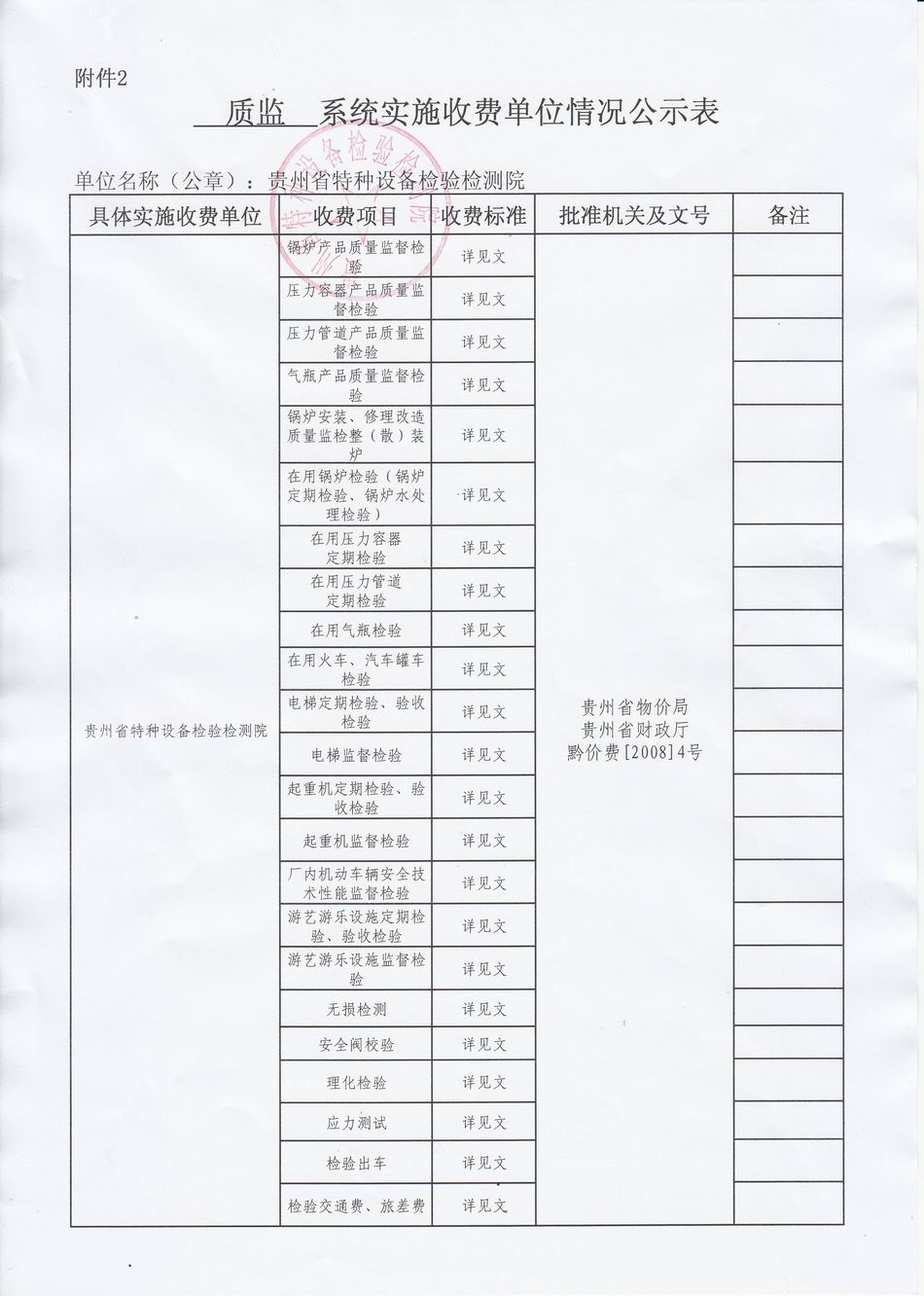 特种设备检验检测收费项目及标准公示表
